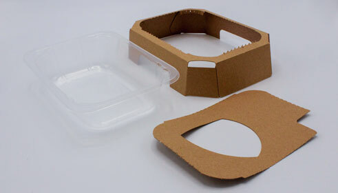 Barquette scellée optimisée combinée à une barquette en carton. Les deux éléments sont couplés mécaniquement, de sorte qu'il n'y a pas d'autre élément de fermeture.
