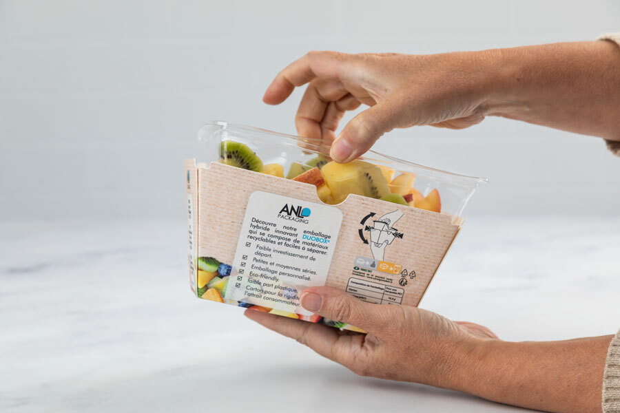 De Duobox gebruikt tot -50% minder plastic terwijl de integriteit behouden blijft dankzij het kartonnen omhulsel. Het kartonnen omhulsel is gemakkelijk te verwijderen, waardoor het gemakkelijk te gebruiken en te recycleren is. Het karton kan aan de buitenkant worden bedrukt om uw product te laten opvallen in het schap. Of aan de binnenkant om uitleg te geven over het klaarmaken van het product of het recycleren van de verpakking.