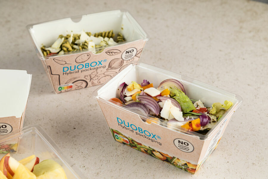 We bedachten de Duobox. De Duobox is geschikt voor vis, vlees, gevogelte en kant-en-klaarmaaltijden. Het maakt gebruik van een inlay van dunwandig plastic dat omhuld is door hoogwaardig karton.